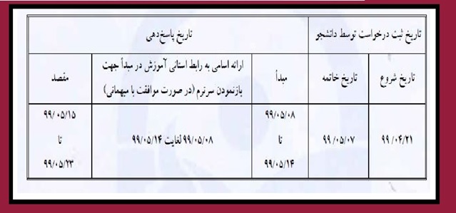 تاریخ ثبت درخواست توسط دانشجو شروع 99/04/21 تاریخ خاتمه 99/05/07 می باشد.