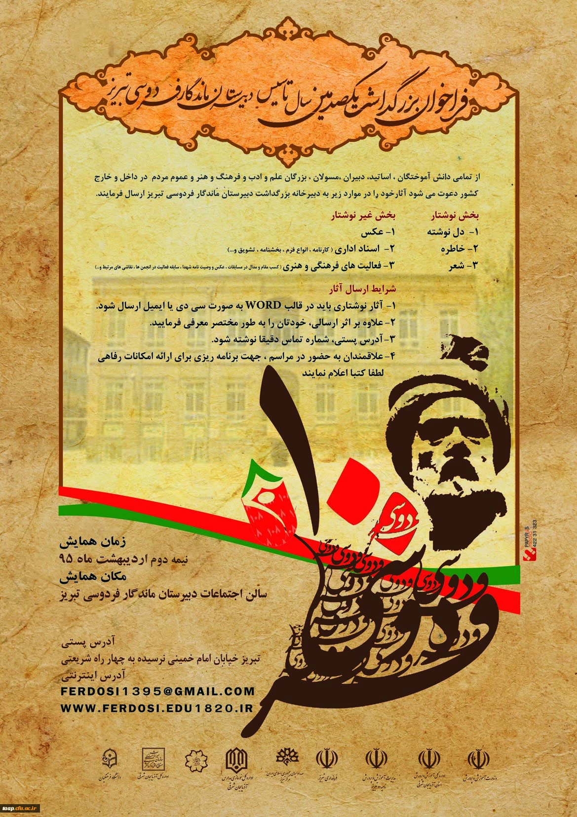 امتیاز دهید : فراخوان بزرگداشت یکصدمین سال تاسیس دبیرستان فردوسی تبریز دوشنبه 30 فروردین 1395 ساعت 13:19
