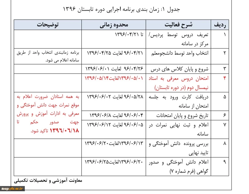 زمانبندی برنامه اجرائی و دروس دوره تابستان 96