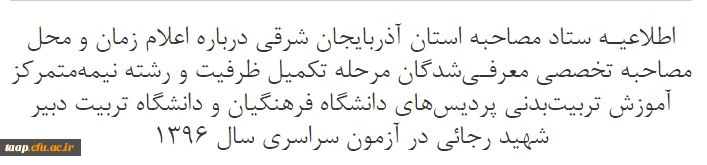 اعلام زمان و محل مصاحبه تخصصی معرفـی شدگان مرحله تکمیل ظرفیت و رشته نیمه متمرکز آموزش تربیت بدنی سال 1396