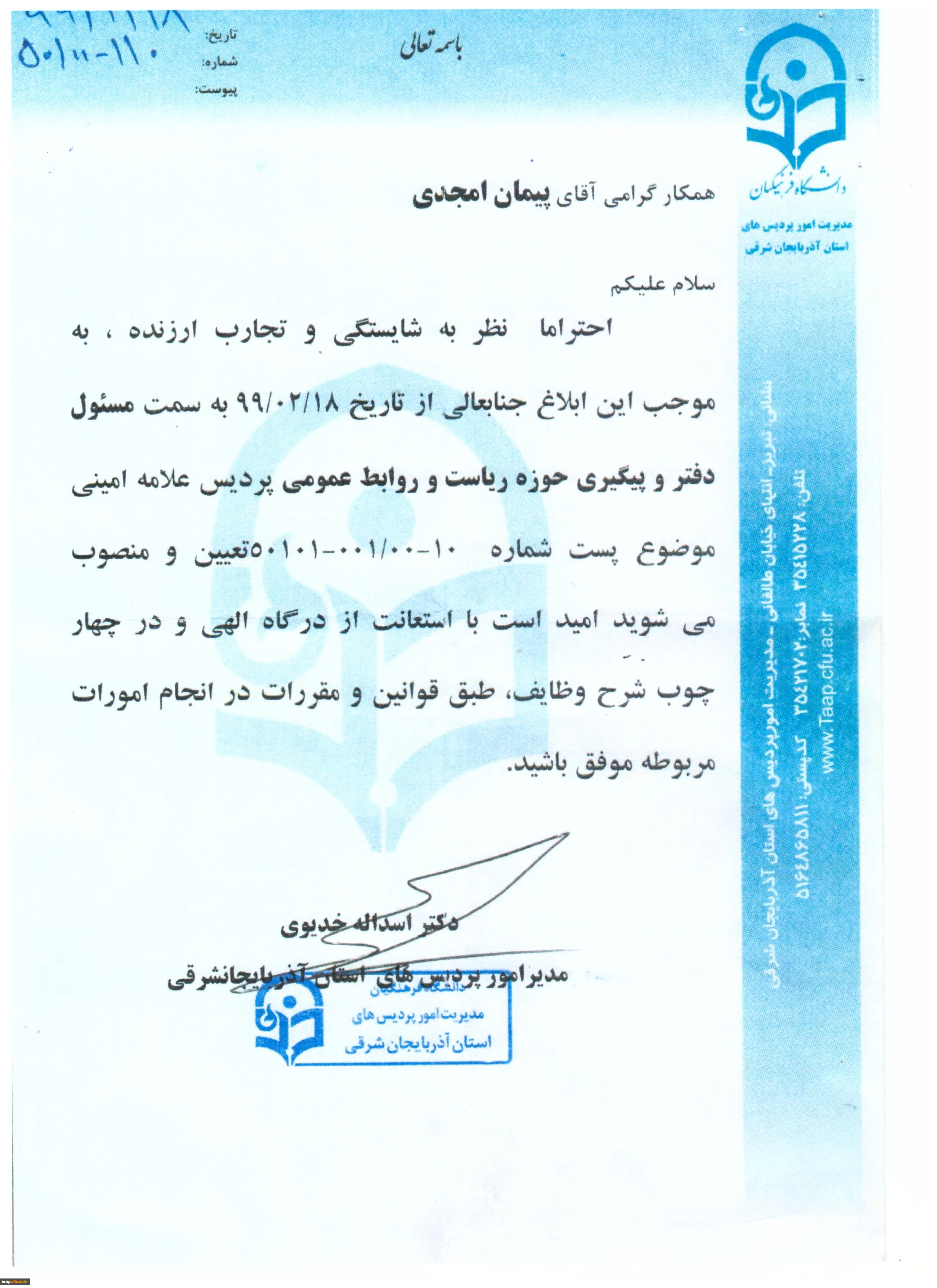 طی حکمی ازسوی دکتر خدیوی رییس دانشگاه، آقای سید پیمان امجدی به سمت مسئول دفتر وپیگیری حوزه ریاست و روابط عمومی پردیس علامه امینی منصوب شد 2
