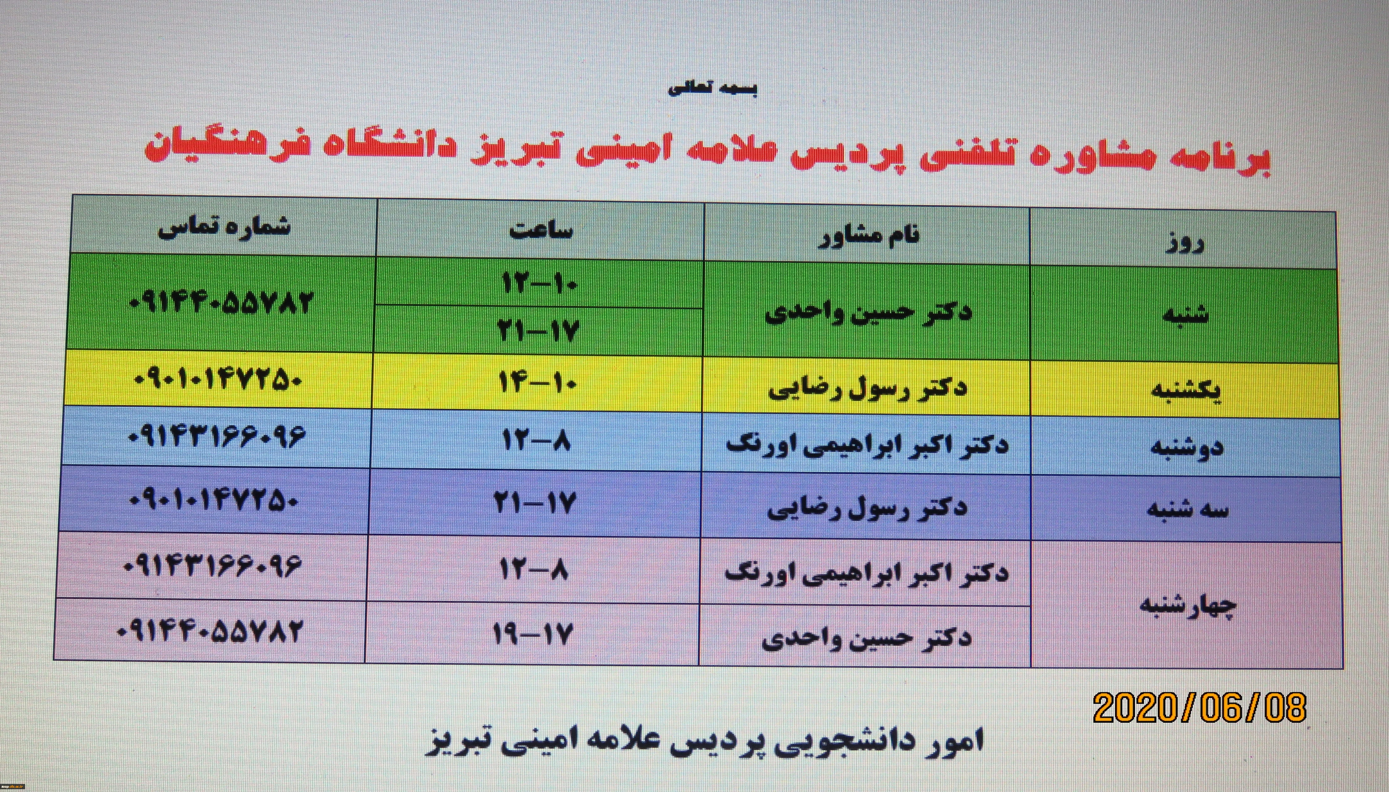 امتیاز دهید : مشاوره تلفنی تمامی دانشجویان و همکاران عزیزدر روزهای تعطیلی دانشگاه 4 دوشنبه 19 خرداد 1399 ساعت 4:51