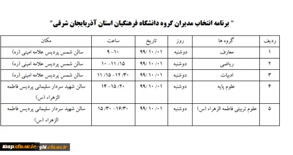 امتیاز دهید : برنامه انتخاب مدیران گروه دانشگاه فرهنگیان استان آذربایجان شرقی 3 دوشنبه 1 دی 1399 ساعت 8:17