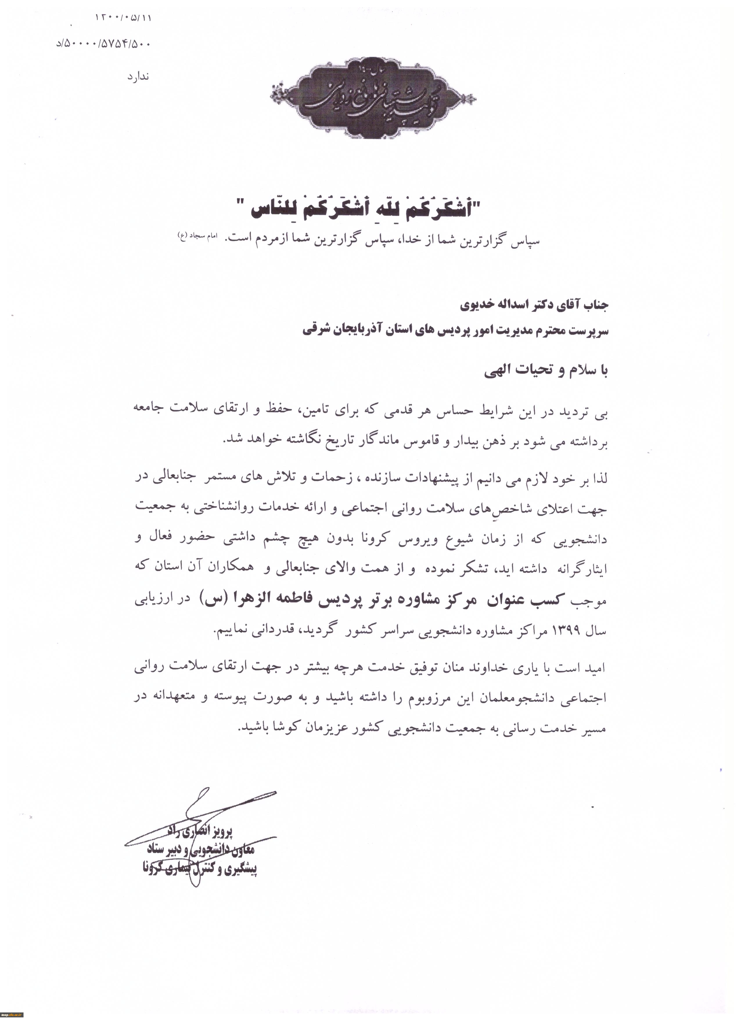 کسب عنوان مرکز مشاوره برترپردیس فاطمه الزهرا(س) 2