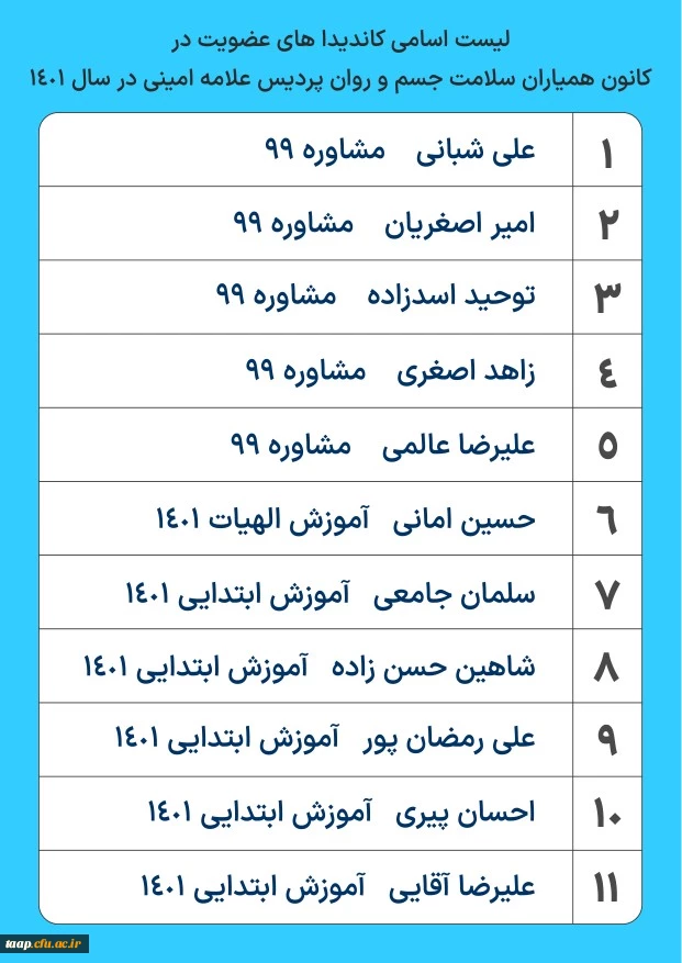 لیست کاندیداهای تایید شده کانون همیاران سلامت جسم و روان پردیس علامه امینی به شرح ذیل اعلام می گردد. 2
