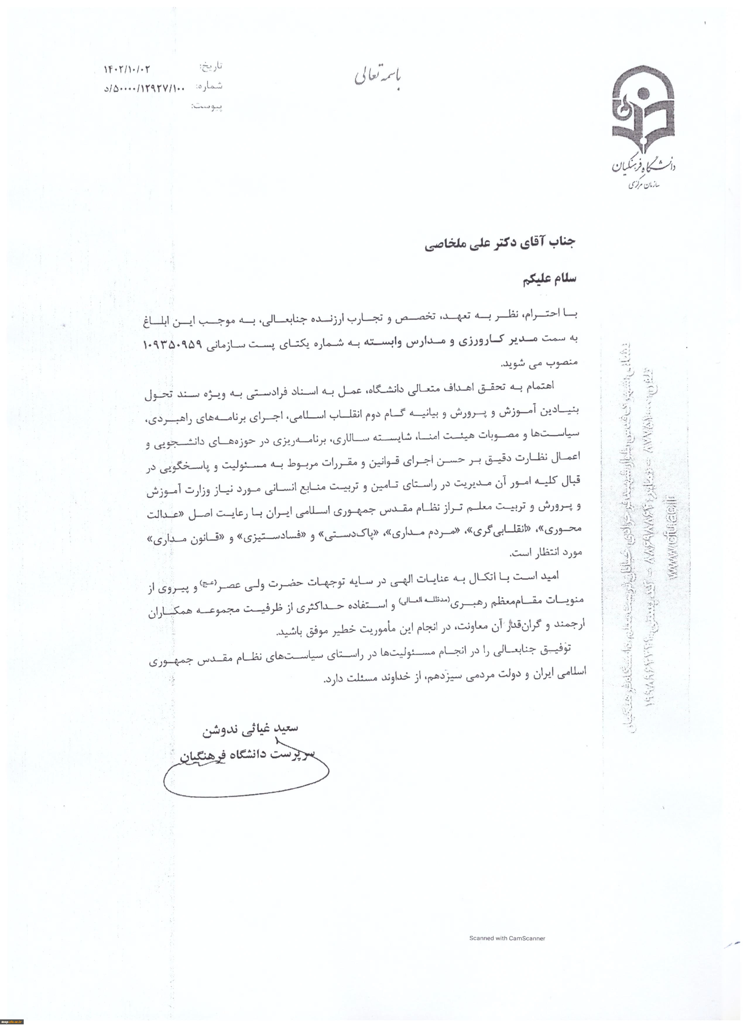 انتصاب جناب آقای دکتر علی ملخاصی به سمت مدیر کارورزی و مدارس وابسته دانشگاه فرهنگیان کشور 2